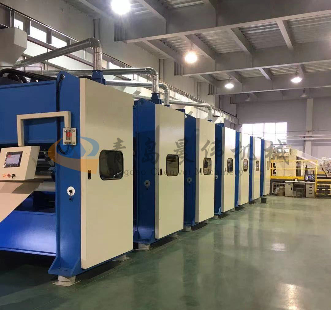 7. CWCQ-切邊成卷機(jī):設(shè)備配置3-5把切刀,可根據(jù)不同產(chǎn)品的尺寸要求將產(chǎn)品切成不同的規(guī)格長度,方便靈活。采用變頻器控制調(diào)速當(dāng)棉層達(dá)到一定的規(guī)格長度時(shí),數(shù)碼記數(shù)收卷,切刀自動(dòng)切斷。收卷輥由收卷電機(jī)驅(qū)動(dòng),收卷速度的控制系統(tǒng)與拉伸機(jī)的驅(qū)動(dòng)系統(tǒng)聯(lián)網(wǎng),與拉伸機(jī)同步,受張力控制器的反饋控制。展開輥使棉層展平,消除棉層在拉伸應(yīng)力作用下產(chǎn)生的一些縱向皺紋。